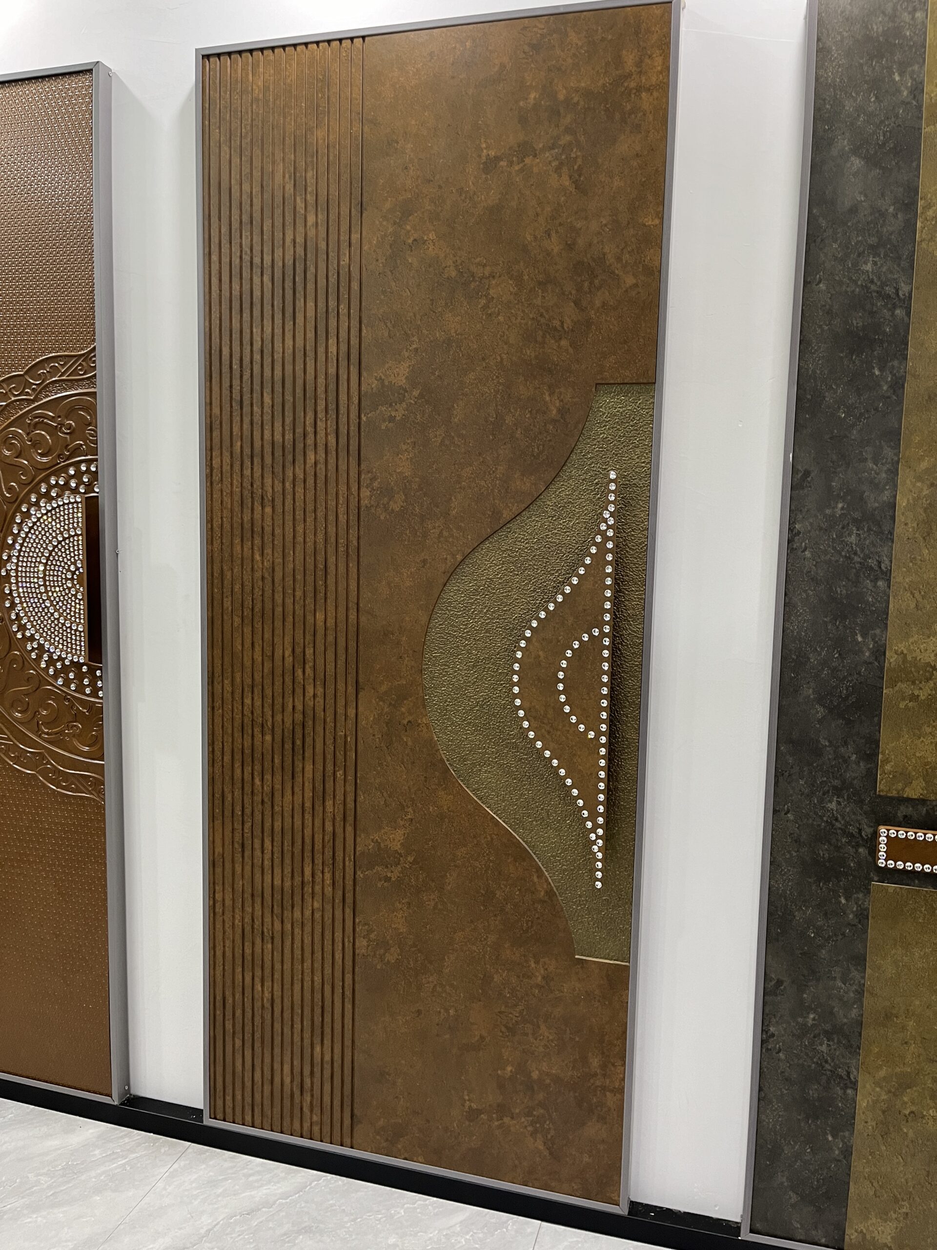 This custom aluminum decorative entrance door features a refined wave-pattern surface combined with crystal inlay detailing, creating a balance between modern geometry and decorative elegance. Designed for architectural and residential projects, this model emphasizes surface texture, light reflection, and visual rhythm rather than traditional ornamentation.