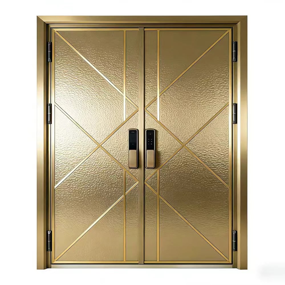 Crafted from high-quality aluminum alloy, this entrance door offers excellent durability, corrosion resistance, and long-term structural stability. The surface is treated with a textured finish that enhances depth and tactile quality, making the door visually dynamic under different lighting conditions.