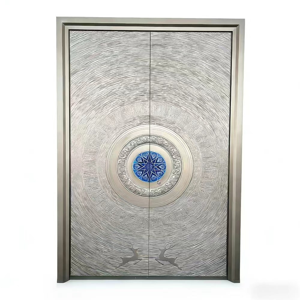 Crafted using high-quality metal materials and advanced surface treatment techniques, the door combines precision geometry, handcrafted texture, and decorative crystal detailing. The radial layout enhances depth and dimension, allowing light to interact subtly with the surface and create a refined, elegant presence at the entrance.